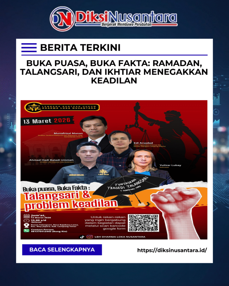 Lampung Timur — Dalam semangat bulan suci Ramadan, Lembaga Bantuan Hukum Dharma Loka Nusantara akan menyelenggarakan diskusi publik dan buka puasa bersama bertajuk “Buka Puasa, Buka Fakta: Talangsari dan Problem Keadilan” pada Jumat, 13 Maret 2026 di Dusun Talangsari, Desa Rajabasa Lama, Kecamatan Way Jepara, Kabupaten Lampung Timur.
