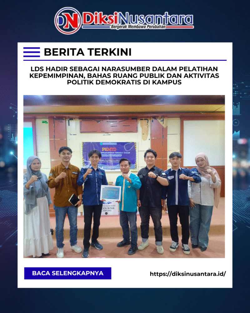 DIKSINUSANTARA, BANDAR LAMPUNG — Lab For Democracy Studies (LDS) hadir sebagai narasumber dalam Pelatihan Kepemimpinan Mahasiswa Tingkat Dasar (PKMTD) yang diselenggarakan oleh Dewan Mahasiswa Fakultas Dakwah dan Ilmu Komunikasi UIN Raden Intan Lampung (UIN RiL), Rabu (22/4/2026).